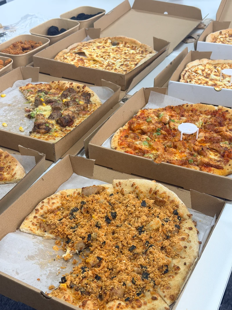 กล่องพิซซ่าเต็มโต๊ะ และสำนักงานก็ถูกห่อหุ้มด้วยกลิ่นหอมอันแสนอร่อยในทันที ความเหนื่อยล้าก็หายไปในเวลาอันรวดเร็ว เพื่อนร่วมงานมองดูมอนิเตอร์ของพวกเขา ดวงตาเป็นประกาย มีคนตะโกนว่า "พิซซ่าอยู่นี่!" และเช่นนั้น ทั้งทีมก็มารวมตัวกัน